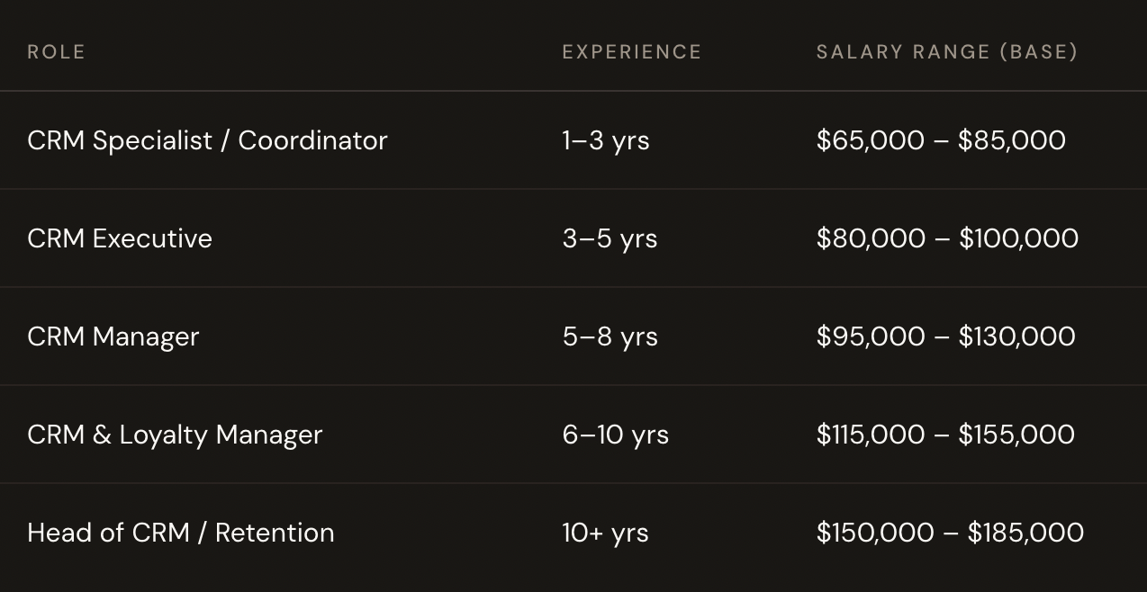CRM salaries vary based on seniority, platform complexity, and whether the role owns a loyalty program. These figures are from Revere Recruitment's 2025 Ecommerce Salary Guide.